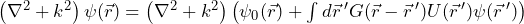 \left( \nabla^2 + k^2 \right) \psi(\vec{r}) = \left( \nabla^2 + k^2 \right) \left( \psi_0(\vec{r}) + \int{d\vec{r}\,' G(\vec{r}-\vec{r}\,') U(\vec{r}\,' ) \psi(\vec{r}\,' ) \right)}